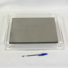 PLACA (21X30 CM) EM AÇO ESCOVADO, COM A INSCRIÇÃO 'AGRADECIMENTO DA ASSOCIAÇÃO BRASILEIRA DAS EMISSORAS DE RÁDIO E TELEVISÃO - ABERT / AO EXCELENTÍSSIMO PRESIDENTE DA REPÚBLICA SR. LUIZ INÁCIO LULA DA SILVA, POR SUA HONROSA DISTINÇÃO EM PRESIDIR A SESSÃO SOLENE DE ABERTURA DO 24º CONGRESSO BRASILEIRO DE RADIODIFUSÃO. BRASÍLIA, 29 DE MAIO DE 2007. / DANIEL PIMENTEL SLAVIEIRO / PRESIDENTE'. NA PARTE SUPERIOR, LOGOMARCA DA INSTITUIÇÃO E DO EVENTO. POSSUI BASE E TAMPO EM ACRÍLICO. ACONDICIONADA EM ESTOJO DE MADEIRA LAMINADA DE PRETO, TENDO NA TAMPA AS MESMAS LOGOMARCAS E O NOME DO PRESIDENTE DA REPÚBLICA.