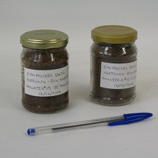 DOIS VIDROS CONTENDO, CADA UM, AMOSTRA DE AREIA, IDENTIFICADOS COM ETIQUETA BRANCA. NO PRIMEIRO, A INSCRIÇÃO 'CACHOEIRA SANTO ANTONIO - RIO MADEIRA / AMOSTRA #5 A JUSANTE / 16/12/2006'. NO SEGUNDO, 'CACHOEIRA SANTO ANTONIO - RIO MADEIRA / AMOSTRA#19 ZÉ PAULINO / 16/12/2006'.