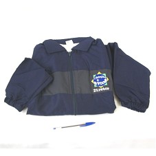 JAQUETA EM TACTEL AZUL MARINHO, DE MANGA COMPRIDA, COM ZÍPER FRONTAL, ELÁSTICO NAS MANGAS E BARRA. FORRADA INTERNAMENTE COM MALHA BRANCA DE ALGODÃO. NA FRENTE, BORDADO EM AZUL, VERDE E BRANCO, COM A INSCRIÇÃO 'O SINTREJÓIAS E VOCÊ / DIRETOR', E DESENHO ESTILIZADO DA BANDEIRA BRASILEIRA.