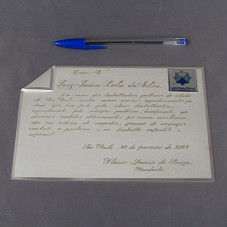 PLACA(14X20 CM) EM PRATA FOSQUEADA, COM BORDAS POLIDAS. POSSUI A INSCRIÇÃO 'EXMO. SR. LUIZ INÁCIO LULA DA SILVA / EM NOME DOS TRABALHADORES JOALHEIROS DO ESTADO DE SÃO PAULO, RECEBA NOSSOS SINCEROS AGRADECIMENTOS POR TUDO QUE TEM FEITO PELA CLASSE TRABALHADORA, .... . SÃO PAULO, 22 DE FEVEREIRO DE 2007 / FLÁVIO INÁCIO DE SOUZA / PRESIDENTE'. POSSUI ADESIVO COM LOGOMARCA DO SINDICATO, NA PARTE SUPERIOR DIREITA. ACONDICIONADA EM ESTOJO FORRADO DE LYCRA AZUL MARINHO.