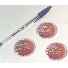VÁRIOS BÓTONS COM FIGURA DE UMA FLOR VERMELHA, FUNDO ROSA, COM A INSCRIÇÃO 'REDUÇÃO DE DANOS SAÚDE E CIDADANIA' EM AMARELO, ACONDICIONADOS EM SACO PLÁSTICO.
