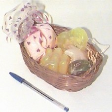 SAIS DE BANHO E QUATRO SABONETES GLICERINADOS, TODOS ARTESANAIS, ACONDICIONADOS EM UMA CESTA DE PALHA (18X12X6 CM).