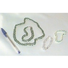 UM COLAR E TRÊS PULSEIRAS CONFECCIONADOS EM MIÇANGAS. COLAR NAS CORES VERDE E BRANCO, PULSEIRAS NAS CORES: VERDE E BRANCO, PÉROLA E AZUL, E , BRANCO E AZUL.