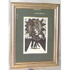 QUADRO (59X46 CM) CONTENDO UMA GRAVURA (33X22.5 CM), EM PRETO E BRANCO, DE UM CASAL SE BEIJANDO SOB A LUZ SOLAR NA COMPANHIA DE UM ANIMAL. MOLDURA DOURADA, PASS-PARTOUT VERDE E COBERTO POR VIDRO.