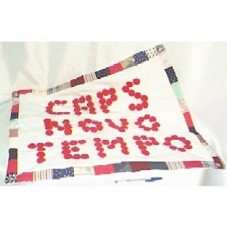 PAINEL (59X70 CM) CONFECCIONADO EM TECIDO BRANCO DE ALGODÃO, FORRADO E ACOLCHOADO, COM BORDA EM RETALHOS DE TECIDOS COLORIDOS. CONTENDO A INSCRIÇÃO 'CAPS NOVO TEMPO', CONFECCIONADA EM FUXICO VERMELHO. CONTÊM QUATRO ILHOSES EM CADA EXTREMIDADE.