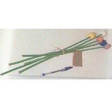 CINCO TULIPAS (46 CM) CONFECCIONADAS EM CERÂMICA, PINTADAS NAS CORES LARANJA, BRANCO, AZUL, AMARELO E LILÁS, COM CAULES EM MADEIRA, PINTADOS EM VERDE. CONTÉM UM INFORMATIVO SOBRE A FLOR, CONFECCIONADO EM PAPEL PARDO.
