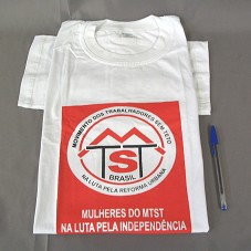 CAMISETA (TAM G) EM MALHA BRANCA, DE MANGA CURTA. NA FRENTE, ESTAMPA EM VERMELHO E PRETO, COM A INSCRIÇÃO 'MOVIMENTO DOS TRABALHADORES SEM TETO / NA LUTA PELA REFORMA URBANA / MULHERES DO MTST NA LUTA PELA INDEPENDÊNCIA' E LOGOMARCA. ATRÁS, NOME DAS INSTITUIÇÕES DE APOIO: CAIXA, GOVERNO FEDERAL E UMVERTEILEN.