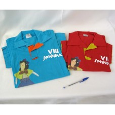 DUAS CAMISETAS (TAM M E G),UMA AZUL E OUTRA VERMELHA, DE MANGA CURTA E GOLA PÓLO. AMBAS POSSUEM A MESMA ESTAMPA COM DESENHO DE UMA BONECA DE PANO E A INSCRIÇÃO 'VIII FENNEART'. ATRÁS, NOME DAS INSTITUIÇÕES DE PATROCÍNIO E REALIZAÇÃO. NA VERMELHA, 'SALÃO DE ARTE POPULAR'; NA AZUL, 'COORDENAÇÃO'.