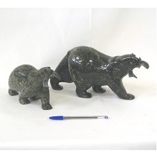 DUAS ESCULTURAS (13X27X10 E 9,5X19X8 CM) EM MÁRMORE/GRANITO ESVERDEADO. CADA UMA REPRESENTA UM URSO POLAR (MÃE E FILHOTE) SOBRE AS QUATRO PATAS, CAMINHANDO COM UM PEIXE NA BOCA. O PEIXE ORIGINÁRIO DA COSTA ÁRTICA. ACONDICIONADAS EM CAIXA FORRADA DE AZUL MARINHO, COM EMBLEMA DO GOVERNO DO CANADÁ NA TAMPA. ACOMPANHA FOLDER EXPLICATIVO DOS OBJETOS.