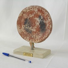 ESCULTURA (15X15,5X1,8 CM), EM CERÂMICA, RÉPLICA DE UMA PEÇA DE MUSEU, NO FORMATO DE UM DISCO, COM ICONOGRAFIAS DISPOSTAS EM ESPIRAL, NAS DUAS FACES. FIXADA EM BASE METÁLICA, E ESTA, EM BASE DE MÁRMORE BEGE, ONDE HÁ PLACA COM A INSCRIÇÃO 'PHAESTOS DISC / 1900 - 1700 B.C.'. ACOMPANHA PEQUENA ETIQUETA EM PAPEL COM INFORMAÇÕES SOBRE A ARTISTA. ACONDICIONADA EM CAIXA DE PAPELÃO BRANCO.