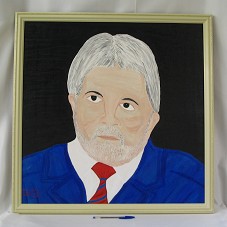 PINTURA SOBRE TELA (69,5X68,5 CM) RETRATANDO O PRESIDENTE LULA, SOBRE FUNDO PRETO. NO CANTO INFERIOR ESQUERDO, A INSCRIÇÃO 'QUADRO O LÍDER / DE: VILMAR SS'. POSSUI MOLDURA (77X76 CM) EM MADEIRA PINTADA DE CREME, COM FRISO DOURADO.