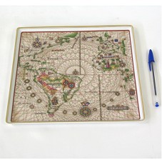BANDEJA (26,5X26,5X1,5 CM) EM PORCELANA BRANCA, COM BORDAS PINTADAS EM DOURADO. POSSUI PINTURA NA PARTE INTERNA, EM COMEMORAÇÃO AO V CENTENÁRIO DA DESCOBERTA DO BRASIL, MOSTRANDO 'PORMENOR DA CARTA DO ATLÂNTICO SUL E DO PACÍFICO ORIENTAL DE JOÃO TEIXEIRA ALBERNAX'. ACONDICIONADA EM CAIXA DE PAPELÃO, NA COR VERDE ESCURA, COM NOME DO FABRICANTE.