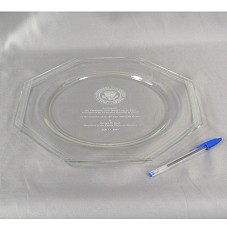 PRATO DECORATIVO (31,7 CM) COM BORDAS EM RECORTE OCTOGONAL, CONFECCIONADO EM CRISTAL. NA PARTE CENTRAL, SELO DO PRESIDENTE DOS EUA E A GRAVAÇÃO 'PRESENTED TO HIS EXCELLENCY LUIZ INÁCIO LULA DA SILVA / PRESIDENT OF THE FEDERATIVE REPUBLIC OF BRAZIL / ON THE OCCASION OF THE XV PAN AMERICAN GAMES / BY GEORGE W. BUSH / PRESIDENT OF THE UNITED STATES OF AMERICA / JULY 13, 2007'. ACOMPANHA CARTÃO DO AGENTE. ACONDICIONADO EM CAIXA PRETA, COM NOME DO FABRICANTE NA TAMPA.