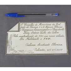 PLACA (10X16 CM) EM PRATA FOSQUEADA, COM BORDAS POLIDAS. POSSUI A INSCRIÇÃO 'O CONSELHO DE MORADORES DO LOT. JOÃO DE BARROS I E II AGUAS CLARAS E CAJAZEIRAS HOMENAGEIAM O PRESIDENTE LUIZ INÁCIO LULA DA SILVA PELA IMPLANTAÇÃO DO PAC EM NOSSO ESTADO. DA MILITANTE E FAM. SABINA ANDRADE OLIVEIRA / SALVADOR, 12/07-2007'. ACONDICIONADA EM ESTOJO FORRADO DE LYCRA AZUL.