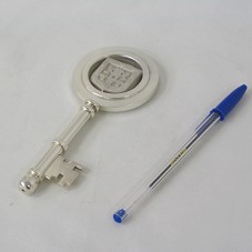 CHAVE (15 CM) DA CIDADE DO MÉXICO, EM METAL PRATEADO. POSSUI SEGREDO DE FORMATO GEOMÉTRICO. PARTE SUPERIOR CIRCULAR, COM O BRASÃO DO GOVERNO DO DISTRITO FEDERAL DO MÉXICO NO CENTRO, MOSTRANDO A FIGURA DE DUAS FERAS AO LADO DE UMA TORRE. ACONDICIONADA EM ESTOJO FORRADO DE MALHA PRETA.