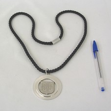 COLAR COM CORDÃO EM CORDA ACETINADA PRETA. POSSUI PINGENTE CIRCULAR, EM METAL PRATEADO, TENDO NA PARTE INTERNA, O BRASÃO DO GOVERNO DO DISTRITO FEDERAL DO MÉXICO, MOSTRANDO A FIGURA DE DUAS FERAS AO LADO DE UMA TORRE. NO REVERSO DO PINGENTE, A INSCRIÇÃO 'PRESIDENTE DE LA REPÚBLICA FEDERATIVA DE BRASIL / 2007 / LUÍZ INÁCIO LULA DA SILVA'. ACONDICIONADO EM ESTOJO FORRADO DE MALHA PRETA.