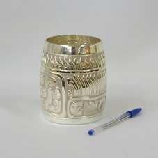 VASO DECORATIVO PEQUENO (12,5X10,5X10,5 CM), EM PRATA 925, DE BASE CIRCULAR, COM DESENHOS DA CULTURA MAIA GRAVADOS AO LONGO DELE. RÉPLICA DE UM ORIGINAL EM CERÂMICA, DO PERÍODO PUUC, GUARDADO NO MUSEU NACIONAL DE ANTROPOLOGIA E HISTÓRIA NA CIDADE DO MÉXICO.