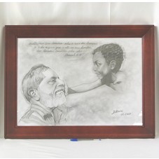 DESENHO (43X61 CM), A GRAFITE, RETRATANDO FOTOGRAFIA USADA NA CAMPANHA PRESIDENCIAL 2006, ONDE O PRESIDENTE LULA É AFAGADO POR UMA CRIANÇA NEGRA. NA PARTE SUPERIOR, A INSCRIÇÃO 'O ALTÍSSIMO TEM DOMÍNIO SOBRE O REINO DOS HOMENS; E O DAR A QUEM QUER E ATÉ AO MAIS HUMILDE DOS HOMENS CONSTITUE SOBRE ELES. DANIEL 4:17'. NO CANTO INFERIOR DIREITO, ASSINATURA O ARTISTA 'J. DADÁ / 07/2007'. POSSUI MOLDURA (55X73 CM) EM MADEIRA AVERMELHADA E TAMPO DE VIDRO.