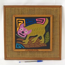 QUADRO (22,5X24,5 CM) EMOLDURANDO PATCHWORK REPRESENTANDO UM GATO. POSSUI FUNDO PRETO, E CORES MARROM, VERDE, OCRE, LARANJA, AZUL E ROSA. NA PARTE INFERIOR DA MOLDURA, A INSCRIÇÃO 'PANAMA'. QUADRO FIXADO EM OUTRA MOLDURA (34,5X36,5 CM) COM PASSE-PARTOUT EM JUTA.