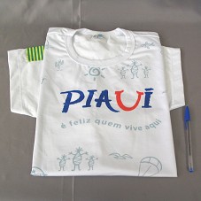 CAMISETA (TAM G) EM MALHA BRANCA, DE MANGA CURTA. NA FRENTE, A INSCRIÇÃO 'PIAUÍ / É FELIZ QUEM VIVE AQUI' E DIVERSOS DESENHOS DA CULTURA REGIONAL. EM UMA DAS MANGAS, A BANDEIRA DO PIAUÍ.