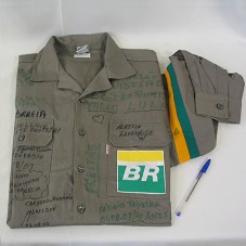 CAMISA (TAM 56) EM BRIM CINZA, DE MANGA COMPRIDA, E DOIS BOLSOS FRONTAIS. EM UM DOS BOLSOS, LOGOMARCA DA 'BR PETROBRAS'. NAS MANGAS, FAIXAS AMARELA E VERDE. POSSUI DIVERSAS ASSINATURAS DA 'COMISSÃO ANISTIADOS EX-PETROMISA'.