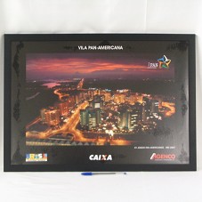 FOTOGRAFIA (31X49 CM) IMPRESSA MOSTRANDO VISTA AÉREA NOTURNA DA 'VILA PAN-AMERICANA', DOS 'XV JOGOS PAN-AMERICANOS -RIO 2007'. NA PARTE INFERIOR, LOGOMARCA DA CAIXA ECONÔMICA, DO GOVERNO FEDERAL, E DA AGENCO ENGENHARIA E CONSTRUÇÕES S.A.. POSSUI MOLDURA PRETA E TAMPO DE VIDRO.