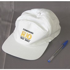 BONÉ EM BRIM BRANCO. NA FRENTE, BORDADO EM PRETO E AMARELO, 'COMISSARIA RIO / ISO 9001'.