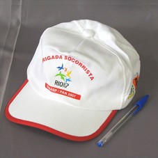 BONÉ EM TECIDO BRANCO, COM DETALHE VERMELHO NA ABA. NA PARTE FRONTAL, A LOGOMARCA OS JOGOS PAN-AMERICANOS RIO 2007 E A INSCRIÇÃO 'BRIGADA SOCORRISTA / SENASP-MJ / PAN 2007'. NAS LATERAIS, LOGOMARCAS DO GOVERNO FEDERAL E ESTADUAL.