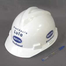 CAPACETE DE PROTEÇÃO, USADO EM CONSTRUÇÃO CIVIL, NA COR BRANCA. NA FRENTE, EM AZUL E CINZA, 'PRESIDENTE LULA / BERTIN / BIODIESEL'. NAS LATERAIS, 'BERTIN / BIODIESEL'.