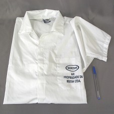 DOIS JALECOS EM TECIDO BRANCO, DE MANGA COMPRIDA, COM FECHAMENTO FRONTAL EM VELCRO E BOLSO INTERNO. NA FRENTE, EM AZUL, EM UM DELES, 'BERTIN / 62 / PROPRIEDADE DA BERTIN LTDA.'; NO OUTRO, 'BERTIN / 54'.