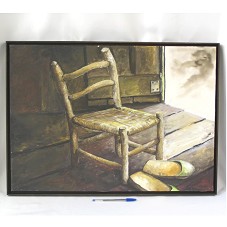 PINTURA (50X70 CM) SOBRE TELA RETRATANDO UMA CADEIRA EM MADEIRA, COM ASSENTO EM PALHA, PRÓXIMA À PORTA DE UMA CASA, COM OS CHINELOS PERTO DELA. NO CANTO INFERIOR DIREITO A ASSINATURA 'TOSTAL'. POSSUI MOLDURA EM MADEIRA ESCURA (52,5X72,5 CM). NA PARTE POSTERIOR, A INSCRIÇÃO 'A SUA EXL. LUIZ IGNACIO LULA DA SILVA, E COM GRANDE PRAZER QUE LHE MANDO ESSA TELA DO ARTISTA PLÁSTICO TOSTAL / 10/08/2007'.