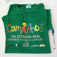 CAMISETA (TAM G) EM MALHA VERDE, DE MANGA CURTA. NA FRENTE, ESTAMPA COLORIDA CONTENDO A INSCRIÇÃO 'CAMINHOS DA ESTRADA REAL / CONSÓRCIO SOCIAL DA JUVENTUDE / FAUF / UFSJ / PRIMEIRO EMPREGO / MINISTÉRIO DO TRABALHO E EMPREGO / GOVERNO FEDERAL'.