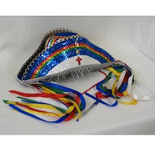 CHAPÉU EM PALHA COBERTO POR LANTEJOULAS COLORIDAS, NAS CORES AZUL, VERMELHO, VERDE, AMARELO E BRANCO E POR VELUDO AZUL; ORNADO COM FITAS COLORIDAS DE CETIM, QUE CAEM PARA AS LATERAIS. POSSUI FRANJAS NA PARTE FRONTAL E POSTERIOR, NA COR PRATA. INTERNAMENTE, ETIQUETA DO FABRICANTE.