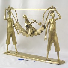 ESCULTURA (44,5X57X10 CM), EM BRONZE, REPRESENTANDO DUAS MULHERES SEMI-NUAS TRANSPORTANDO UM JOVEM EM UMA REDE SUSTENTADA POR UM MASTRO, QUE ELAS SUPORTAM NA CABEÇA. FIGURA DO JOVEM SENTADO SOBRE A REDE, FUMANDO UM GRANDE CACHIMBO.
