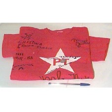 CAMISETA EM MALHA DE ALGODÃO VERMELHA, TAMANHO 'XG', COM A ESTRELA DO 'PT' PINTADA EM BRANCO, VÁRIOS AUTÓGRAFOS E BÓTON COM A FOTO DO PRESIDENTE LUIZ INÁCIO LULA DA SILVA E A INSCRIÇÃO 'AGORA É 13 - LULA PRESIDENTE'.