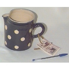 JARRA COM ALÇA (12X13 CM) EM CERÂMICA ESMALTADA, NA COR AZUL MARINHO COM BOLAS CREMES. INTERIOR EM CREME. CONTÉM CARTÃO DO FABRICANTE COM AS INSCRIÇÕES 'POTERIE ARTISANALES FABRICANT TE: 04.50.03.25.67 HARTMANN 3837 RN 203 74800 ETEAUX' E COM DEDICATÓRIA NA PARTE POSTERIOR 'POTERIE TRADITIONNELLE SOWAYARDE OFFERTE PAR L'ARTISAN POTIER. CHRISTIAN ORAISON'.