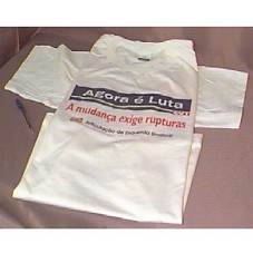 CAMISETA (TAM 'G') EM MALHA, NA COR BRANCA, COM INSCRIÇÃO 'AGORA É LUTA (ESCRITO EM BRANCO, DENTRO DE UM RETÂNGULO EM AZUL COM FAIXAS VERDE E AMARELO) A MUDANÇA EXIGE RUPTURAS (EM VERMELHO) ARTICULAÇÃO DE ESQUERDA SINDICAL (EM PRETO)', COM A ESTRELA DO PT E A SIGLA CUT.