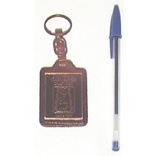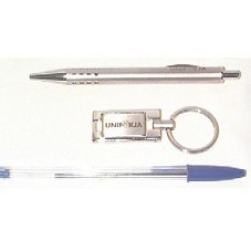 CANETA E CHAVEIRO EM METAL PRATEADO, COM INSCRIÇÃO 'UNIFORJA', ACONDICIONADOS EM CAIXA DE PAPELÃO PRATEADA.