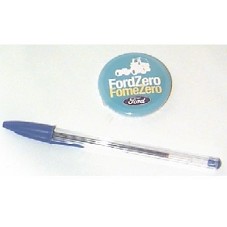 BÓTON AZUL COM DESENHO DE UM CAMINHÃO EM BRANCO, E INSCRIÇÃO EM BRANCO E AMARELO 'FORD ZERO FOME ZERO', COM A MARCA DA FORD.