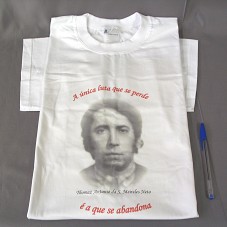 CAMISETA (TAM GG) EM MALHA BRANCA, DE MANGA CURTA. NA FRENTE, ESTAMPA COM FOTOGRAFIA EM PRETO E BRANCO DE 'THOMAZ ANTONIO DA S. MEIRELES NETO', E A INSCRIÇÃO 'A ÚNICA LUTA QUE SE PERDE É A QUE SE ABANDONA'.