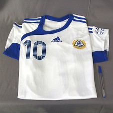 CAMISA DE FUTEBOL (TAM GG) DA SELEÇÃO FINLANDESA, EM TECIDO BRANCO, COM DETALHES EM AZUL. NA FRENTE, NO NÚMERO '10', A LOGOMARCA 'ADIDAS' E BRASÃO DA ASSOCIAÇÃO DE FUTEBOL DA FINLÂNDIA 'SPL / FBF'. ATRÁS, 'LITMANEN / 10'.