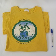 CAMISETA (TAM G) EM MALHA AMARELA, DE MANGA CURTA. NA FRENTE, ESTAMPA COM DESENHO DE UM HOMEM ANDANDO DE BICICLETA E A INSCRIÇÃO 'EDGARD GAIO / CICLOVIDA / WWW.CICLOVIDA.COM.BR'. ATRÁS, O NÚMERO '1' E MESMA INSCRIÇÃO.