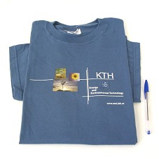 CAMISETA (TAM M) EM MALHA AZUL-ACINZENTADA, DE MANGA CURTA. NA FRENTE, ESTAMPA COM TRÊS FOTOGRAFIAS COLORIDAS E A INSCRIÇÃO 'KTH / ENERGY AND ENVIRONMENTAL TECHNOLOGY / WWW. EMT. KTH.SE'. ACOMPANHA BÓTON QUADRADO, EM METAL DO PRATEADO, COM FRENTE EM AZUL, POSSUINDO UMA COROA E RAMOS A SUA VOLTA, E A GRAVAÇÃO 'KTH VETENSKAP OCH KONST'.