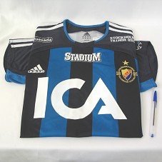 CAMISA DE FUTEBOL (TAM G) DO TIME SUECO 'DJURGARDENS IF FOTBOLL', COM LISTRAS VERTICAIS NAS CORES AZUL E PRETO. NA FRENTE, BORDADO O BRASÃO DO TIME E A MARCA 'ADIDAS'. POSSUI A INSCRIÇÃO 'STADIUM ICA'. ATRÁS, O NÚMERO '19' E 'ICA / QUIRINO'.