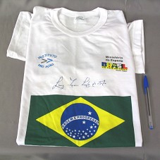 CAMISETA (TAM G) EM MALHA BRANCA, DE MANGA CURTA. NA FRENTE, BANDEIRA DO BRASIL COM ASSINATURA DO PRESIDENTE LULA NA PARTE SUPERIOR, LOGOMARCA DO GOVERNO FEDERAL E DO 'INSTITUTO PRO AÇÃO'. ATRÁS, LOGOMARCA DO 'PROGRAMA SEGUNDO TEMPO'.