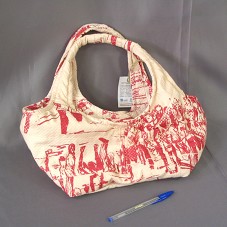 BOLSA FEMININA EM TECIDO SALMÃO, COM ESTAMPA EM CARMIM. ACOLCHOADA INTERNAMENTE. POSSUI ETIQUETA COM A LOGOMARCA DA ONG 'AÇÃO COMUNITÁRIA DO BRASIL / RIO DE JANEIRO'.