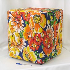 PUFE RETANGULAR (47X42X42 CM), ENCAPADO COM TECIDO DE CHITA, COM FLORES COLORIDAS, PREDOMINANDO OS TONS DE LARANJA E AMARELO E AZUL.