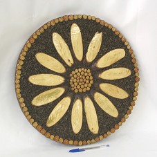 MANDALA CIRCULAR (45 CM), EM MADEIRA. CONFECCIONADA EM ESTILO MOSAICO, COM FIXAÇÃO DE PEÇAS DE MADEIRAS (TRONCOS) EM BASE DE MESMO MATERIAL, FORMANDO DESENHO DE UMA FLOR. ENTRE OS PEDAÇOS DE MADEIRA, SERRAGEM DE MADEIRA PINTADA NA COR MARROM. ATRÁS, GANCHO PARA FIXAÇÃO EM PAREDE, E ETIQUETA COM A INSCRIÇÃO 'MANDALAS EM MADEIRAS / ESTILO MOSAICO / ZÉLIA E GÊ / 61 - 3039-1759/8173-5888/9955-1080'.