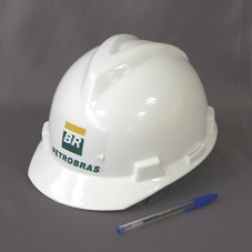 CAPACETE DE PROTEÇÃO, USADO EM CONSTRUÇÃO CIVIL, NA COR BRANCA. NA FRENTE, ADESIVO COM LOGOMARCA DA 'PETROBRÁS'.