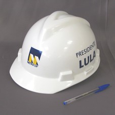 CAPACETE DE PROTEÇÃO, USADO EM CONSTRUÇÃO CIVIL, NA COR BRANCA. NA FRENTE, ADESIVO EM AZUL, AMARELO E BRANCO, COM LOGOMARCA DO 'METRÔ DF'. NAS LATERAIS, 'PRESIDENTE LULA'.